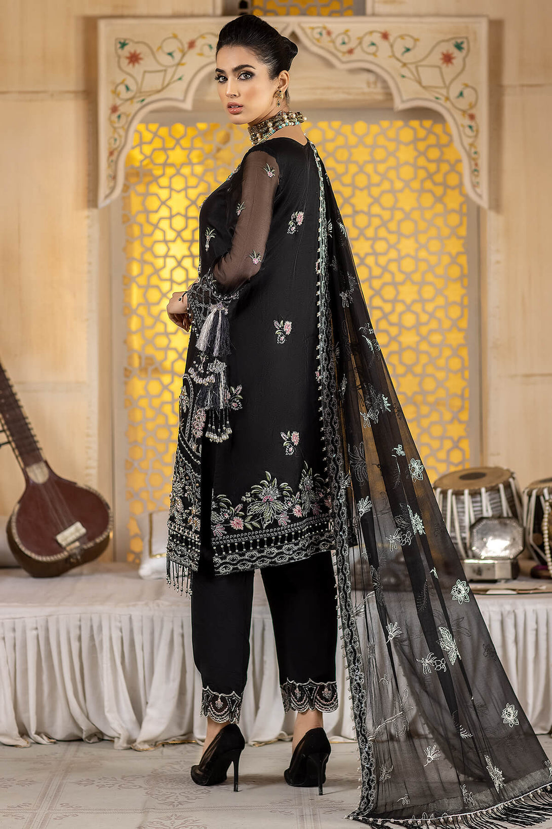 Exude utmost class, an enchanting black ensemble accentuated with delicate yet intricate embroidery. Accompanying the shirt is a finely crafted chiffon dupatta and a dyed trouser giving the look the perfect ethereal vibe.