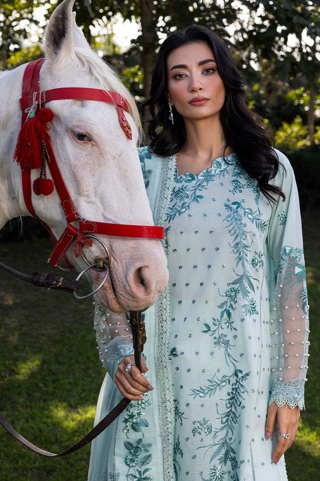 • Embedded Sleeves Border On Organza With Punching Pearls